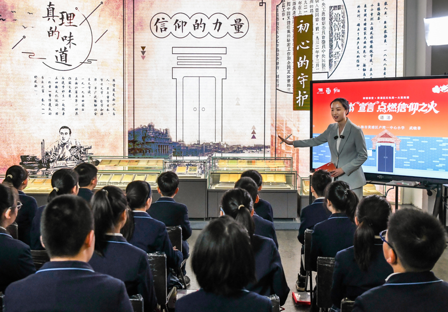 在中共一大顾忌馆,学生凝听“一册书”焚烧“一派火”谈法课 照相:陶磊