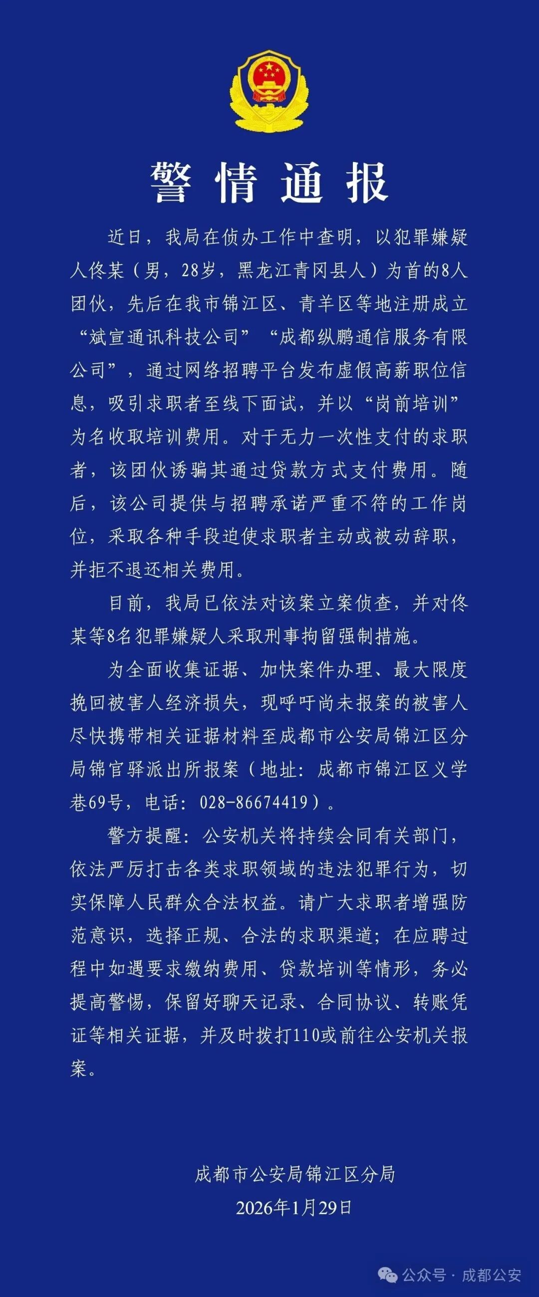 为全面收集证据、加快案件办理、最大限度挽回被害人经济损失,现呼吁尚未报案的被害人尽快携带相关证据材料至成都市公安局锦江区分局锦官驿派出所报案(地址:成都市锦江区义学巷69号,电话:028-86674419)。