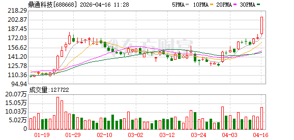 4月16日盘中科创板股鼎通科技涨停,界限10:50,股价报207.23元,成交24.11亿元,换手率8.84%,振幅17.79%。