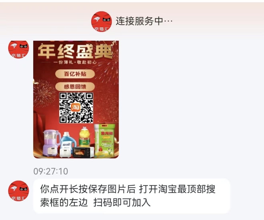 按照指引,小梦打开浏览器扫描了图册上的二维码。“滴”一声后,浏览器迅速跳转进入了“礼品兑换中心”页面,一位名为“超级管理员”的客服人员弹出询问信息:“请问您是来兑换三张礼品卡的吗?”根据客服的提示,小梦提供了礼品卡照片及个人手机号,核对编码及信息成功后,客服确认小梦为“京东特邀用户”,可以兑换一份生活用品礼包、九阳豆浆机或苏泊尔烤箱二选一,及50元现金。在客服的引导下,小梦依次兑换了三份礼品。“第一份礼品可选米面粮油及洗护用品礼包,我说家里不需要,客服又提出可以折现30元,我提供了微信收款码后,很快便有30元入账。”小梦告诉记者,这样“爽快”的收入,使得她更为自信。就在即将兑换最为“重头”的现金和家电提货卡之际,客服开始提出要求:使用淘宝扫码进入一个“礼品兑换群”。