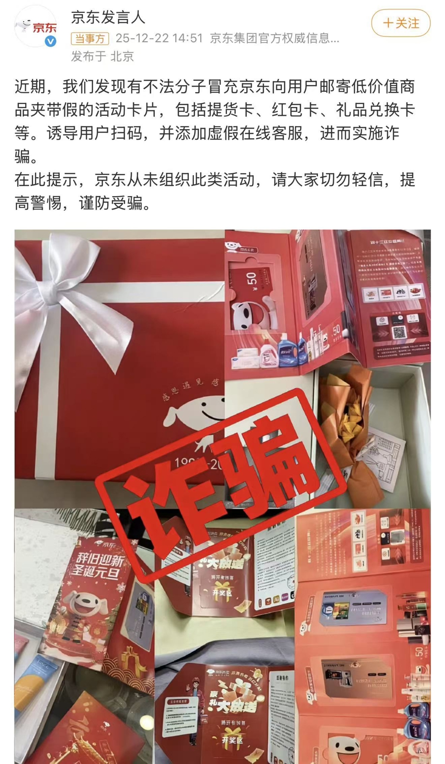记者在社交平台发现,此类礼包有多种形式,随盒附赠的除了小梦拿到的护手霜以外,还有香薰、Labubu公仔、京东的小狗公仔及碗勺组合套装等,其外包装除了带有京东标识的红色盒子外,还有一款粉色草莓熊款式,外部手提袋上写有“爱的抱抱”。这些看似贴心、可爱的设计,本质就是为了吸引扫码,一步步引诱收货人进入骗局。事实上,京东官方也曾于2025年12月22日发布反诈提示,称京东从未组织过寄送提货卡、红包卡及礼品兑换卡等的活动,此类诱导用户扫码的行为,用户切莫轻信。