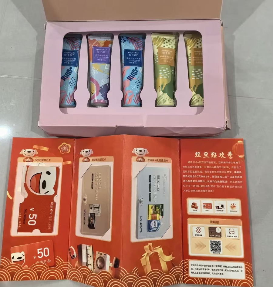 △拆开的礼盒中,包含了护手霜及3张礼品卡。