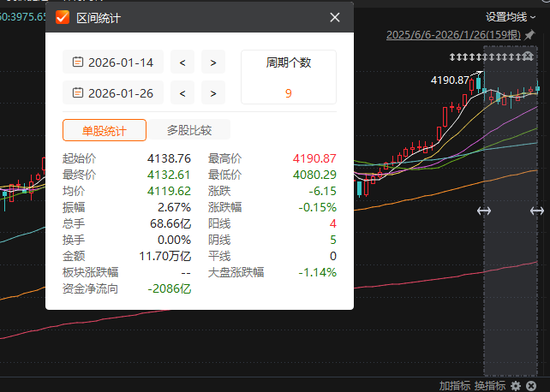 1月14日以来,A股大盘整体呈现震荡整理为主、结构性分化加剧的走势特征。以上证指数为例,在1月14日创下阶段高点4190.87点后,围绕4100点整数关口窄幅波动,期间累计下跌0.15%。