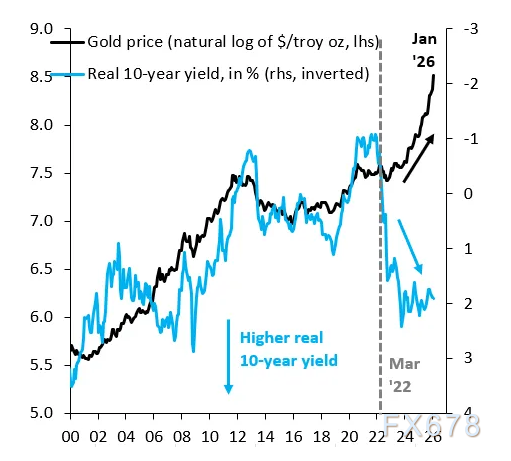 下图中的黑线显示了黄金价格的自然对数,而蓝线则代表经通胀调整的10年期美国国债实际收益率(已将其数值倒置并显示在右侧坐标轴)。从历史上看,当实际利率上升时,金价往往会下跌,这合乎逻辑,因为黄金不产生利息,当利率上升时,持有黄金的机会成本也随之增加。
