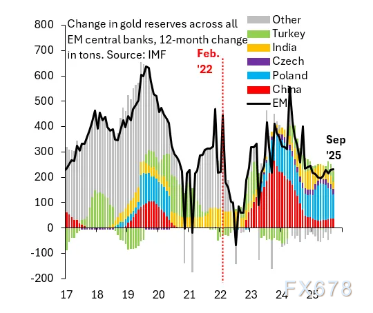 尽管市场上热议美国将美元“武器化”的制裁行为,促使外国央行将官方储备从美元转向黄金——尤其是在俄乌冲突后对俄制裁浪潮之后,但目前并无证据支持这一说法。下图展示了国际货币基金组织(IMF)统计的新兴市场购金数据,其中有四点值得关注。