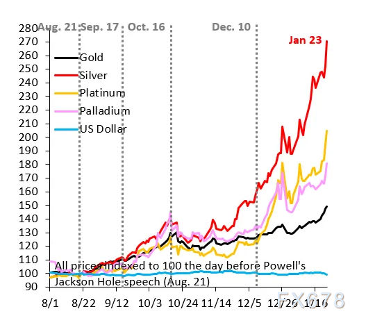自8月22日鲍威尔主席在杰克逊霍尔研讨会发表鸽派主旨演讲以来,黄金价格已上涨50%,而那次研讨会正是这场“货币贬值交易”的开端。关于金价上涨的驱动因素,目前众说纷纭,因此本文将阐述市场上能够概括当前局势的四点看法。