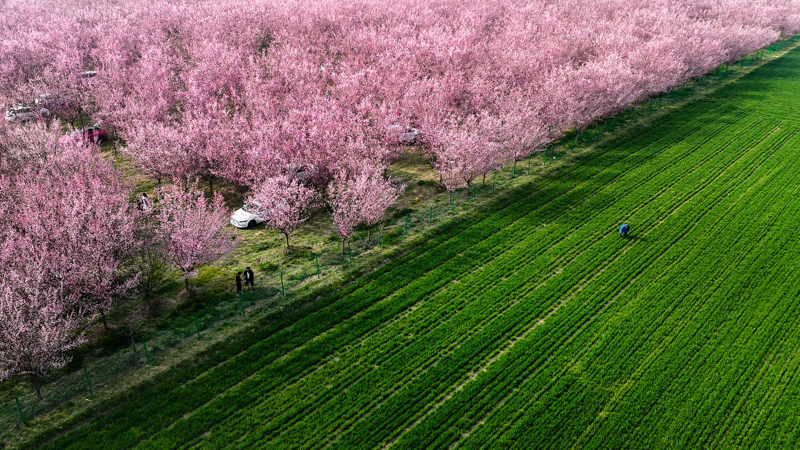 3月11日拍摄的西安市鄠邑区甘河街谈丁村的梅花培植园(无东谈主机像片)。 新华社记者 邹竞一 摄