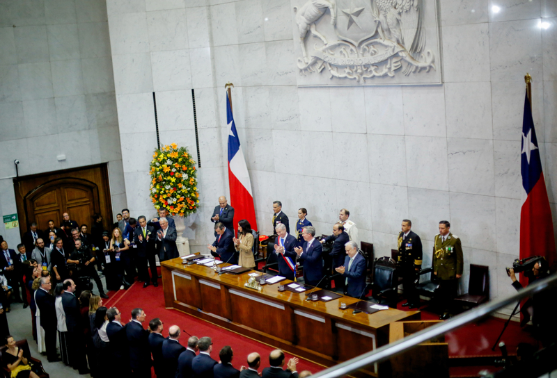 3月11日,在设于智利第二大城市瓦尔帕莱索的国民议会,智利总统何塞·安东尼奥·卡斯特(中,率领绶带者)出席总统职权交代庆典。 新华社/智利一号通信社