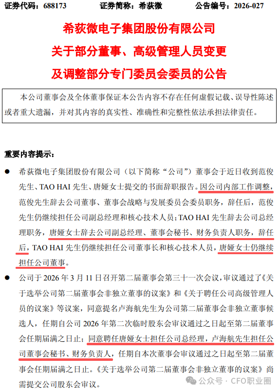 2026年3月12日,上交所科创板上市公司希荻微(688173.SH)发布的公告涌现,因公司里面使命调理,唐娅女士辞去公司副总司理、董事会通告、财务追究东说念主职务,辞任后,唐娅女士仍络续担任公司董事。公司董事会欢喜遴聘唐娅女士担任公司总司理,卢海航先生担任公司董事会通告、财务追究东说念主。