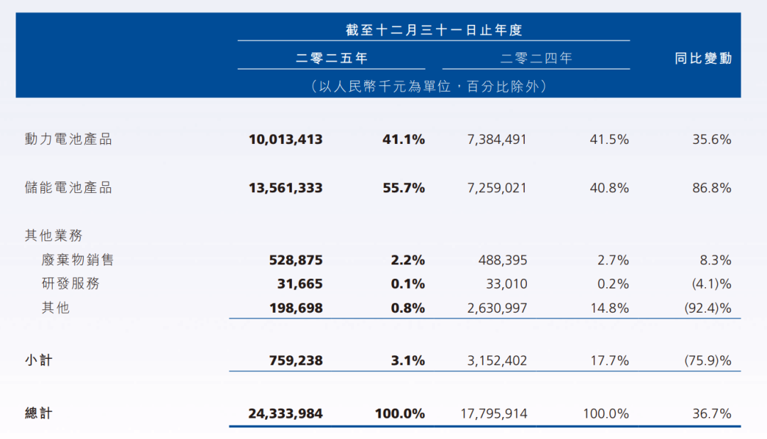 2025年全年共销售82.7GWh锂电板产物,同比增长约89.2%。