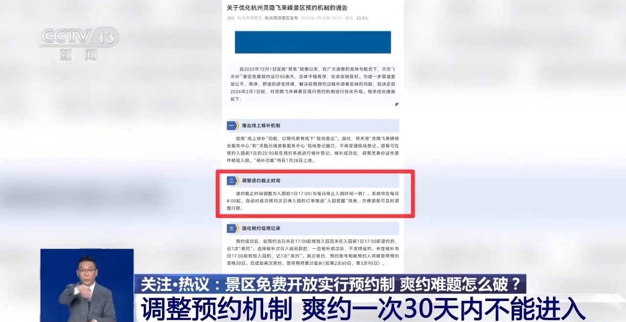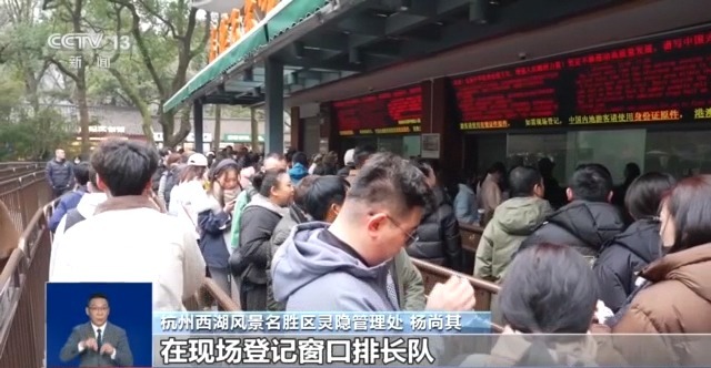 杭州西湖风景名胜区灵隐管理处 杨尚其:这段时间的运行中发现了一些新情况,部分游客因为担心约不上,采取先约了再说或同时锁定多人名额的做法。也有一些游客没有预约上在现场登记窗口排长队,导致现场等候时间长,体验感不佳。特别是每日约而未到的游客数量也是呈增长态势,1月3日当天,就有超2.2万人爽约,超过了当日核定入园总量的1/3。