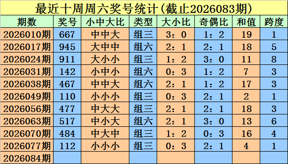久联优配奖号类型判断:近期周六组六开出较少,当期遗漏2周,组三出现较多,本周六要点温煦组六号码。